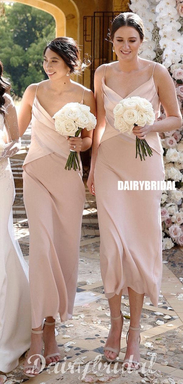 Spaghetti Straps A-line Backless V-neck Tea-length Bridesmaid Dress, FC4569