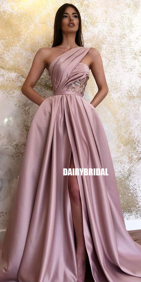One Shoulder A-line Satin Backless Slit Prom Dress with Pockets, FC3774