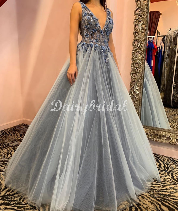 Sexy Deep V-neck Backless A-line Sleeveless Prom Dresses, FC4472
