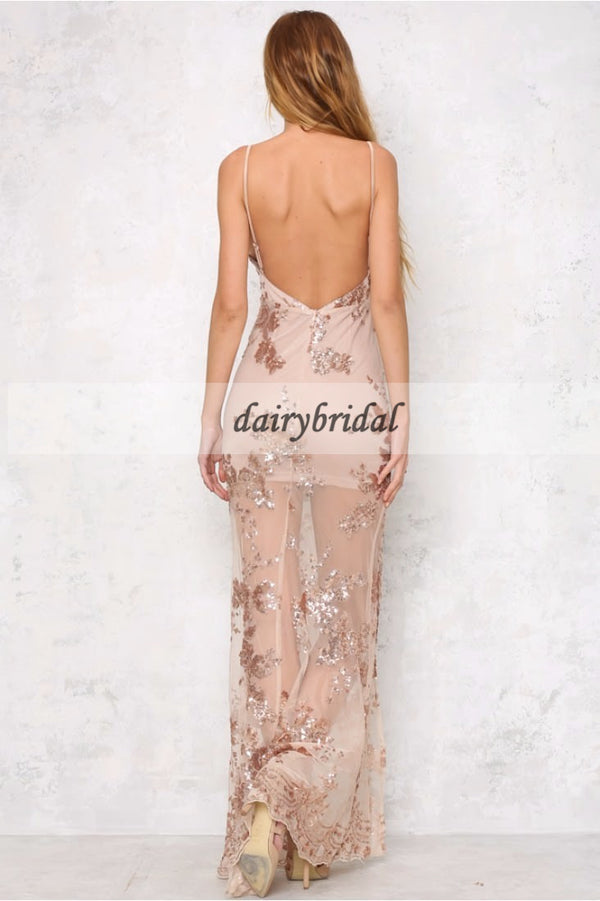 Sexy Deep V-Neck Prom Dress, Backless Lace Prom Dress, Side Split Prom Dress, D349