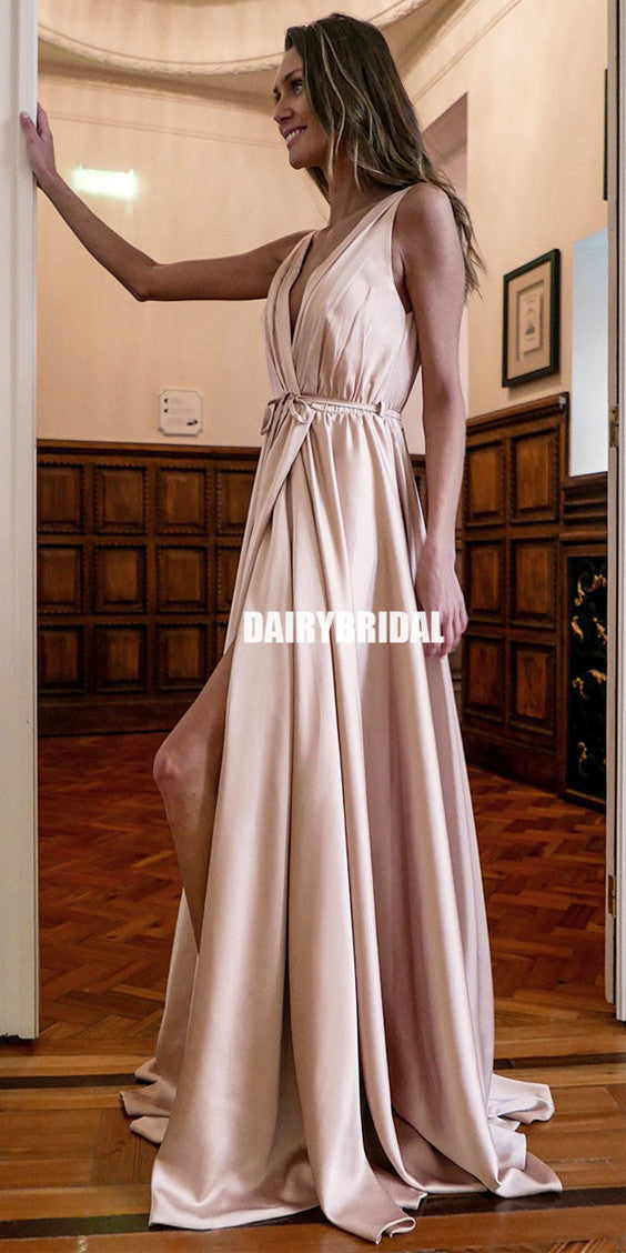 Simple A-line Sleeveless V-neck Slit Backless Prom Dresses, FC2406 Simple A-line Sleeveless V-neck Slit Backless Prom Dresses, FC2406