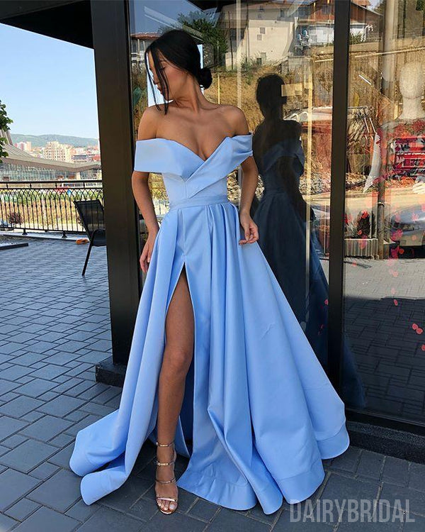 Gorgeous Off Shoulder A-line Backless Satin Slit Long Prom Dresses, FC2129 Gorgeous Off Shoulder A-line Backless Satin Slit Long Prom Dresses, FC2129