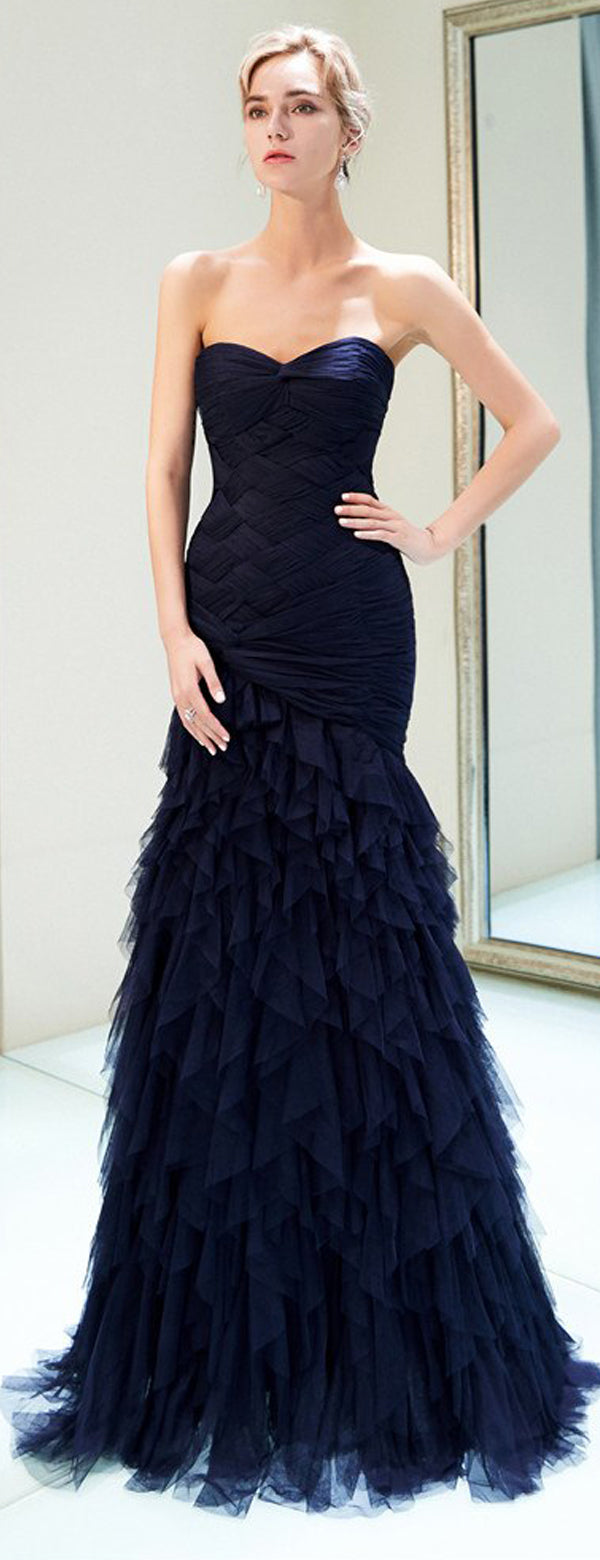 Navy Blue Mermaid Tulle Pleated Backless Cheap Sweetheart Prom Dresses, FC1783