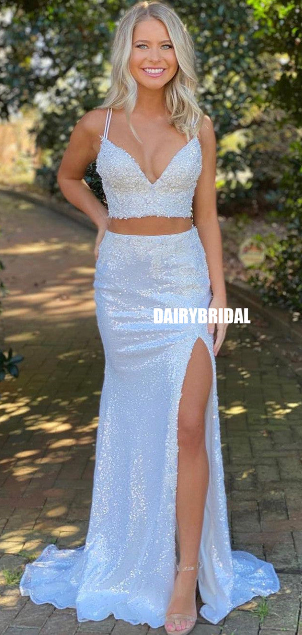 Two Pieces Mermaid V-neck Sexy Backless Slit Prom Dresses, FC5810 Two Pieces Mermaid V-neck Sexy Backless Slit Prom Dresses, FC5810