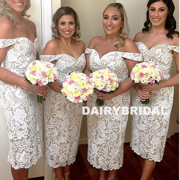 Off Shoulder Lace Tea-Length Bridesmaid Dress, Backless Mermaid Slit Bridesmaid Dress, D696