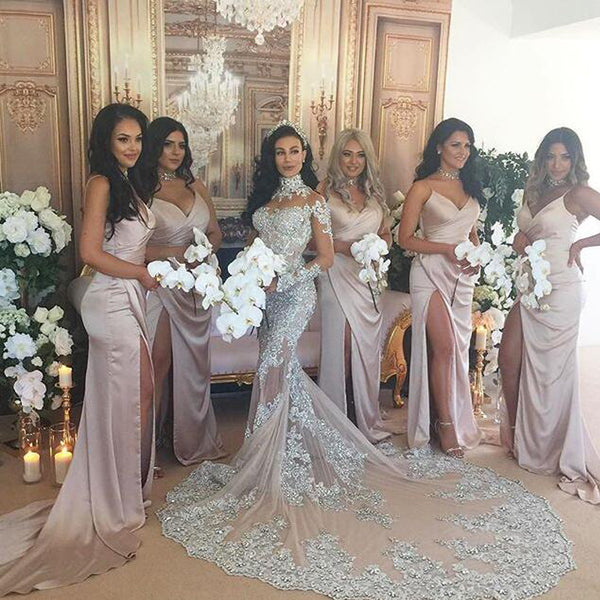 Sexy V-Neck Slit Bridesmaid Dress, Mermaid Soft Satin Bridesmaid Dress, D1211