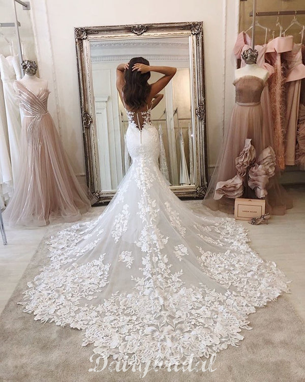 Gorgeous Mermaid Lace Spaghetti Straps Backless Applique Wedding Dresses, FC4312 Gorgeous Mermaid Lace Spaghetti Straps Backless Applique Wedding Dresses, FC4312