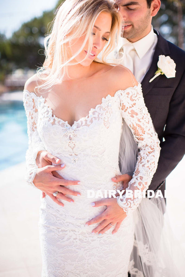 Off Shoulder Lace Long Wedding Dresses, Long Sleeve Charming Mermaid Wedding Dresses, D910