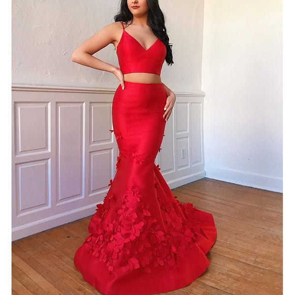 Red Two Pieces Mermaid Satin Backless Applique Prom Dresses, FC2393