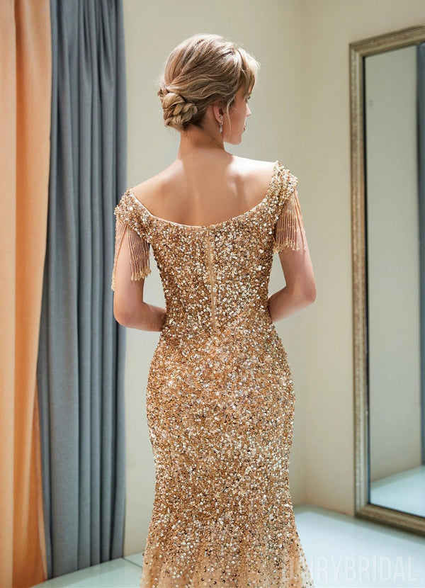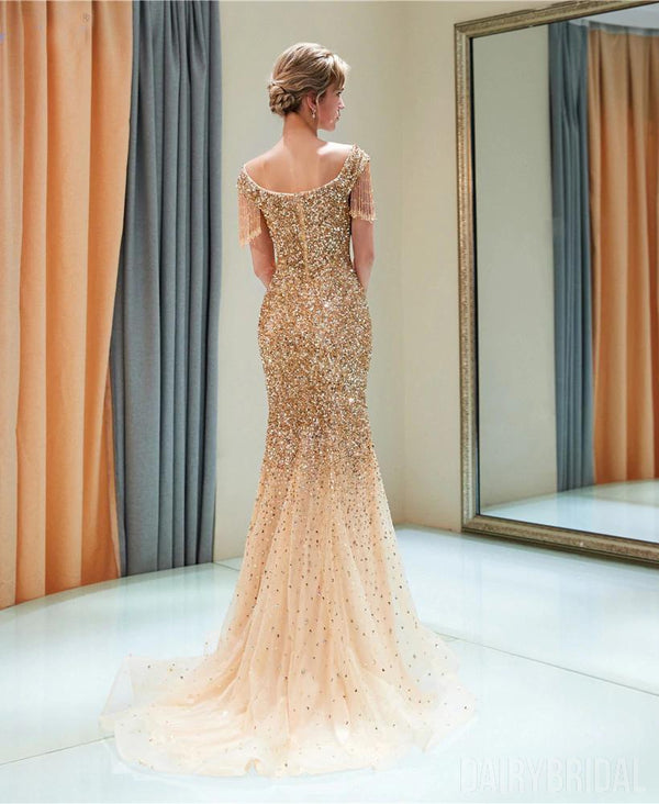 Sparkly Sequin Cap Sleeve Tulle Mermaid Backless Beaded Prom Dress, FC1777