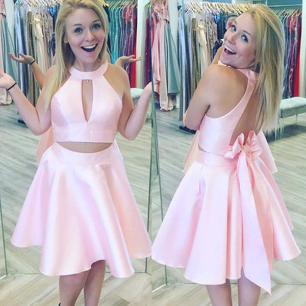 Short Homecoming Dress, Satin Homecoming Dress, Halter Homecoming Dress, Two Pieces Junior School Dress, Knee-Length Homecoming Dress, Open-Back Homecoming Dress, LB0425