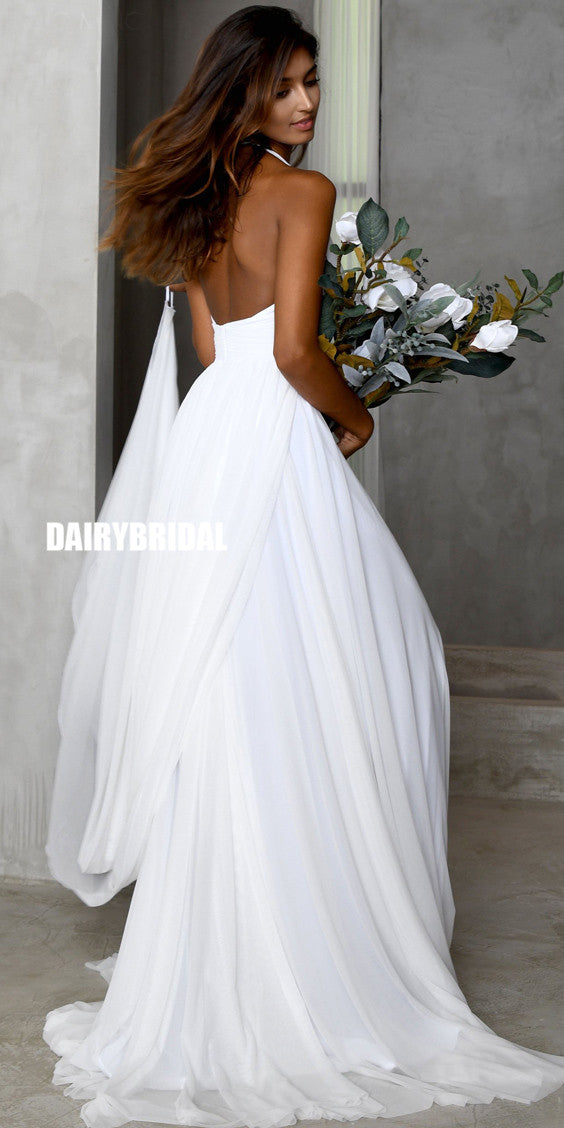 Simple A-line Chiffon Slit Deep V-neck Backless Wedding Dresses, FC2558