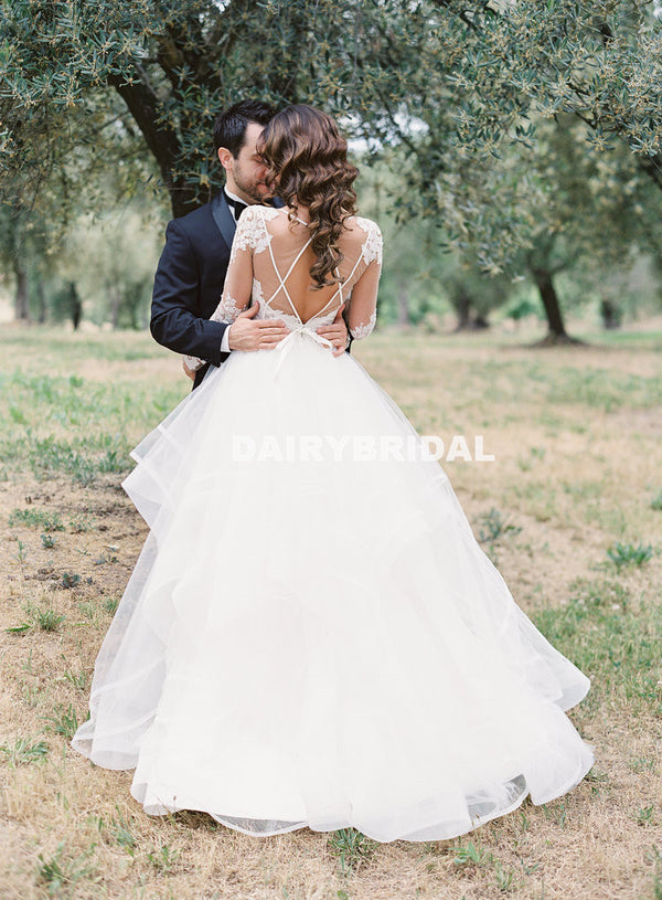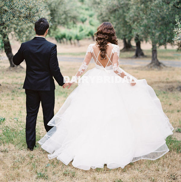Lace Long Sleeve A-Line Wedding Dress, Cheap Open-Back Organza Wedding Dress, D948