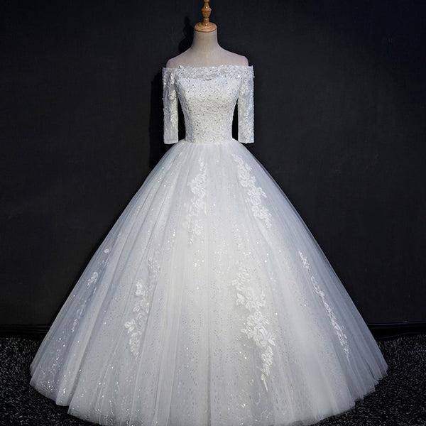 Long Wedding Dress, Off-Shoulder Wedding Dress, A-Line Bridal Dress, Applique Wedding Dress, Sequin Wedding Dress, Half-Sleeve Wedding Dress, LB0435 Long Wedding Dress, Off-Shoulder Wedding Dress, A-Line Bridal Dress, Applique Wedding Dress, Sequin Wedding Dress, Half-Sleeve Wedding Dress, LB0435