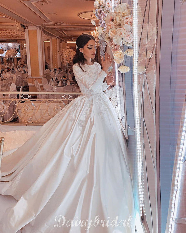 Luxury A-line Satin Long Sleeves Lace Appliques Wedding Dresses, FC4188