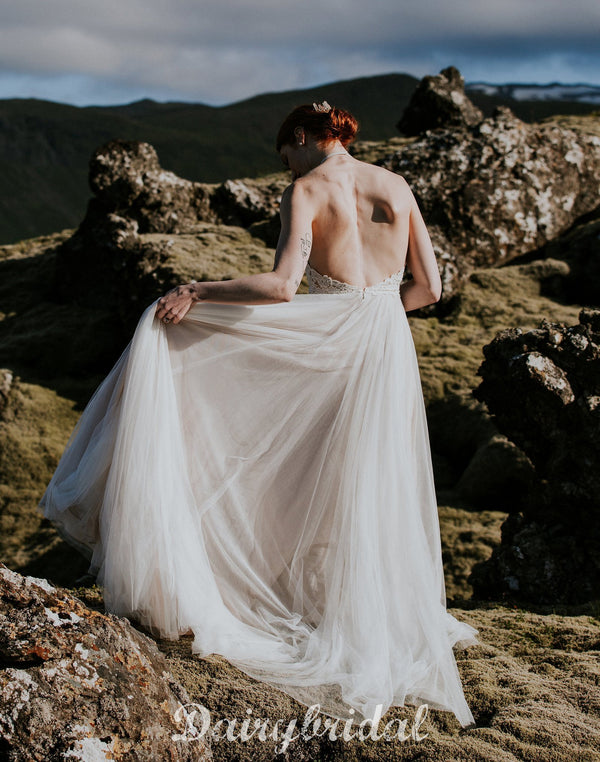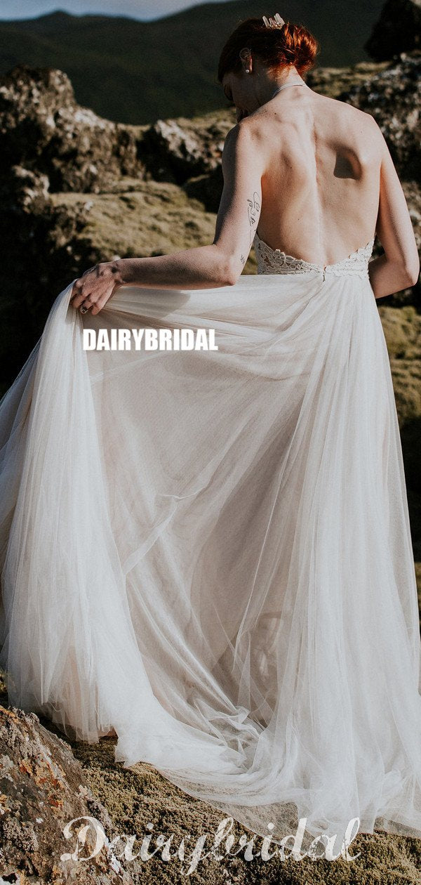 Halter Lace Top A-Line Backless Tulle Cheap Beach Wedding Dress, FC1647 Halter Lace Top A-Line Backless Tulle Cheap Beach Wedding Dress, FC1647
