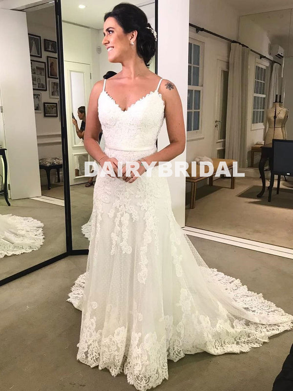 Sexy V-Back A-Line Wedding Dress, Vintage Lace Spagehtti Straps Wedding Dress, D1052