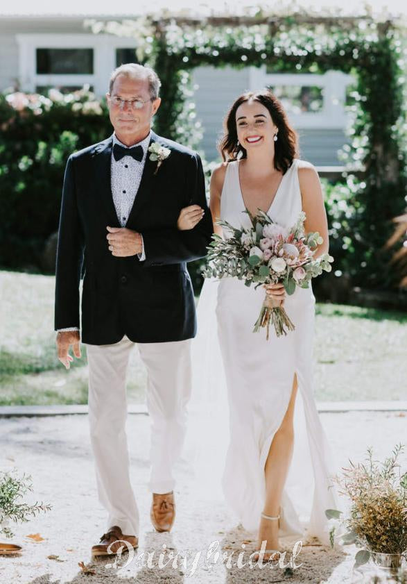 Simple Deep V-Neck Elastic Satin Backless Slit Wedding Dresses, FC1681