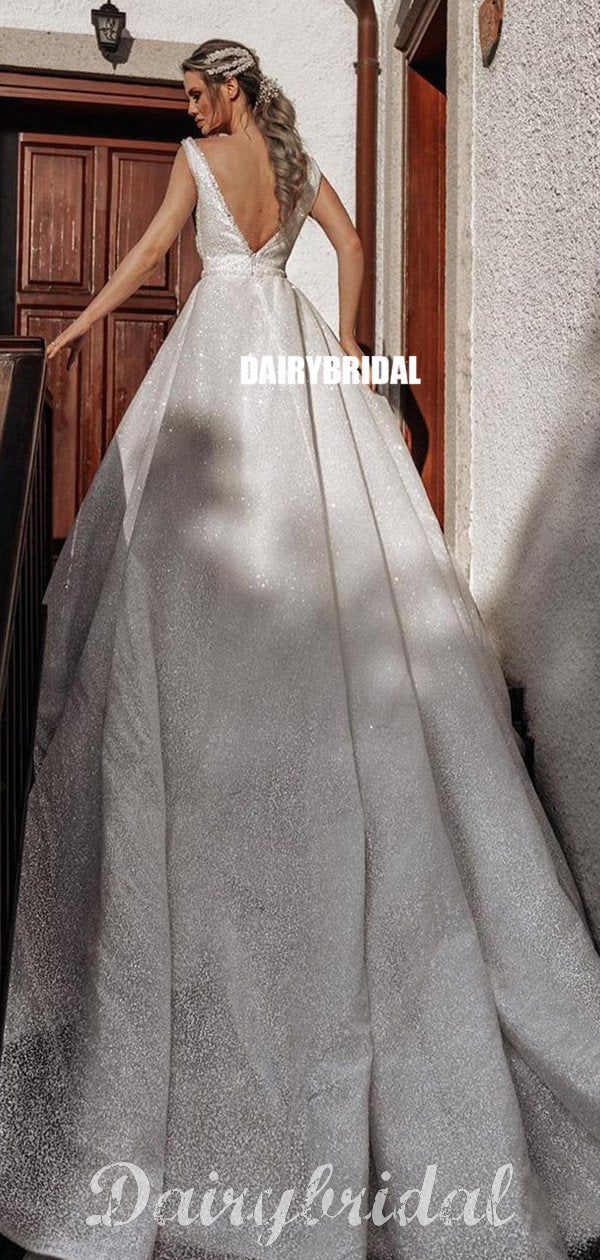 Sparkly A-line V-neck Backless Tulle Sleeveless Wedding Dresses, FC3916 Sparkly A-line V-neck Backless Tulle Sleeveless Wedding Dresses, FC3916