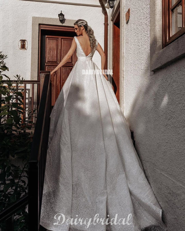 Sparkly A-line V-neck Backless Tulle Sleeveless Wedding Dresses, FC3916