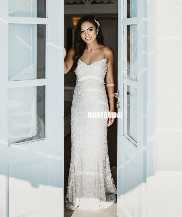 Spaghetti Straps Mermaid Beaded Sequin Backless Charming Wedding Dress, FC1998
