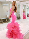 Halter Mermaid Soft Satin Pink Long Organza Dresses, FC7048