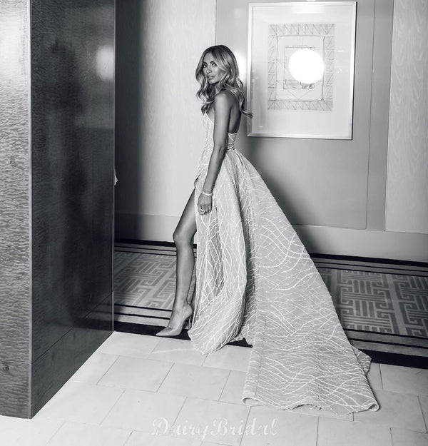 Unique A-line Tulle Backless Beaded Slit Sexy Prom Dresses, FC4035